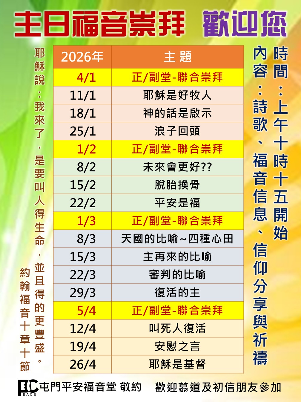 [福音崇拜]早上十時十五分開始,適合慕道及初信者參加。
